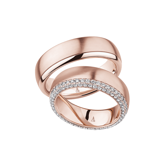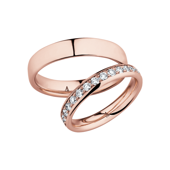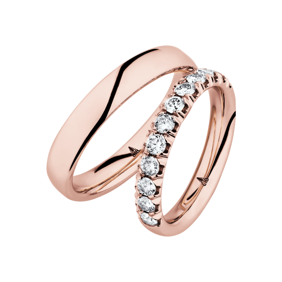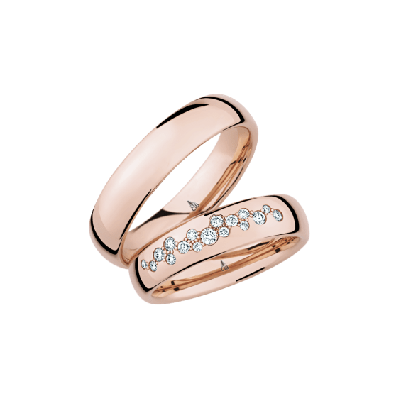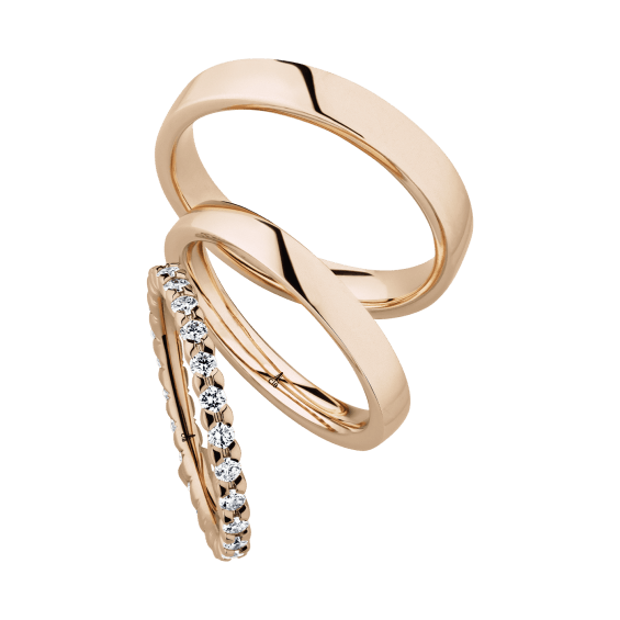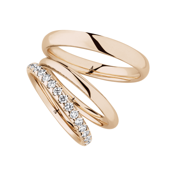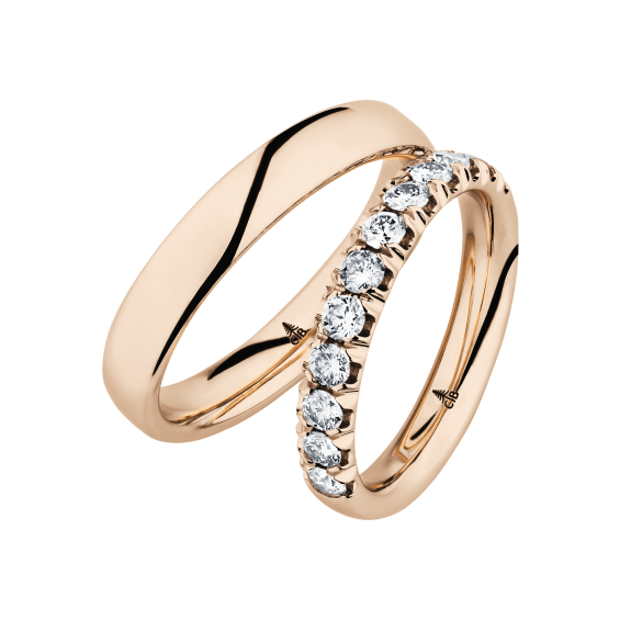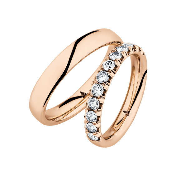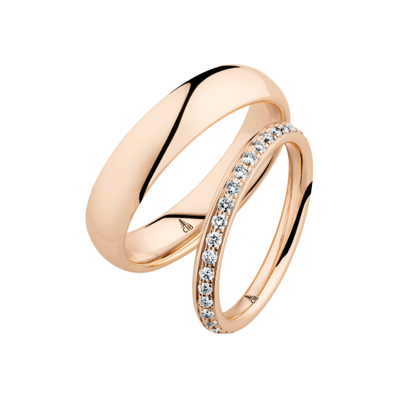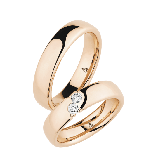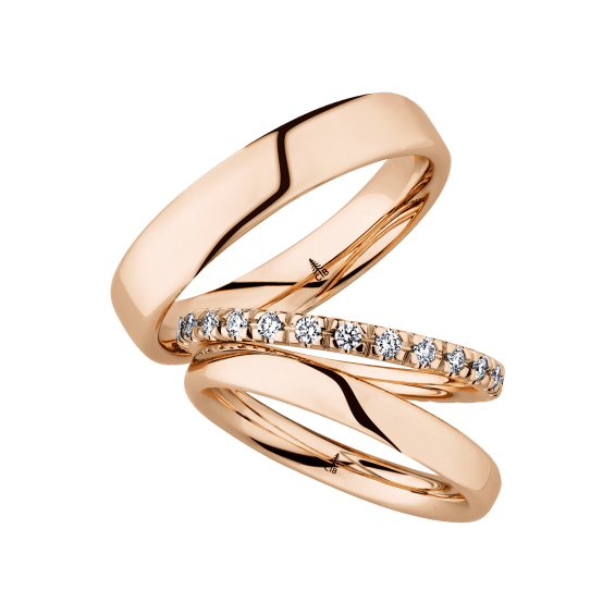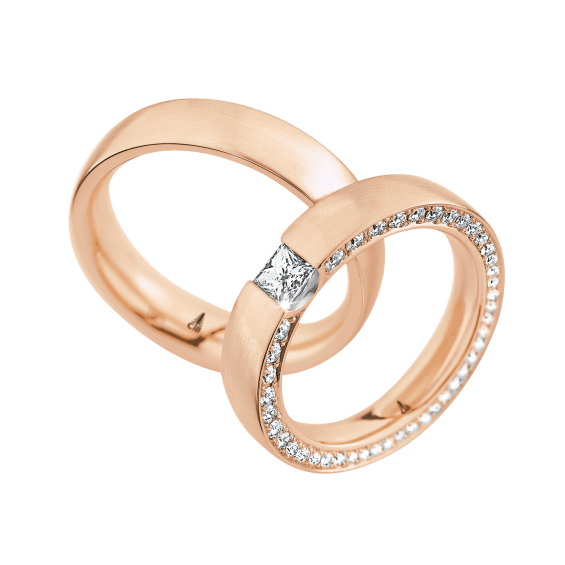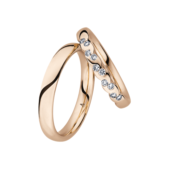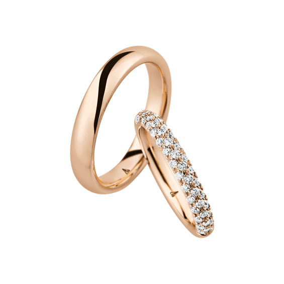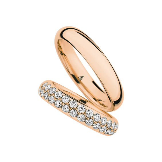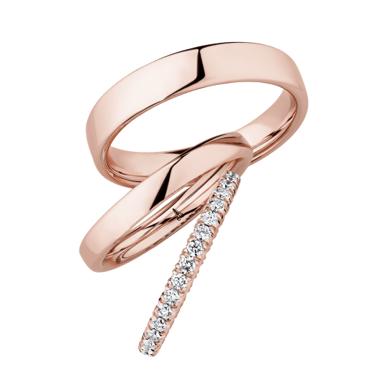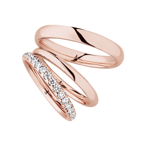 The round shape of the rings and the warm color of the rose gold form a successful unit with the unusual design of the diamond settings.