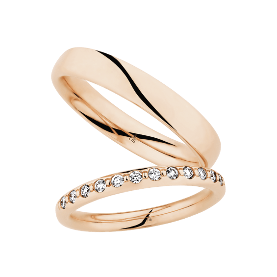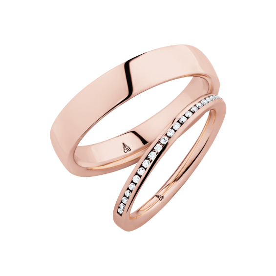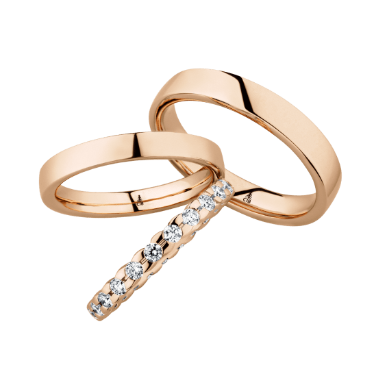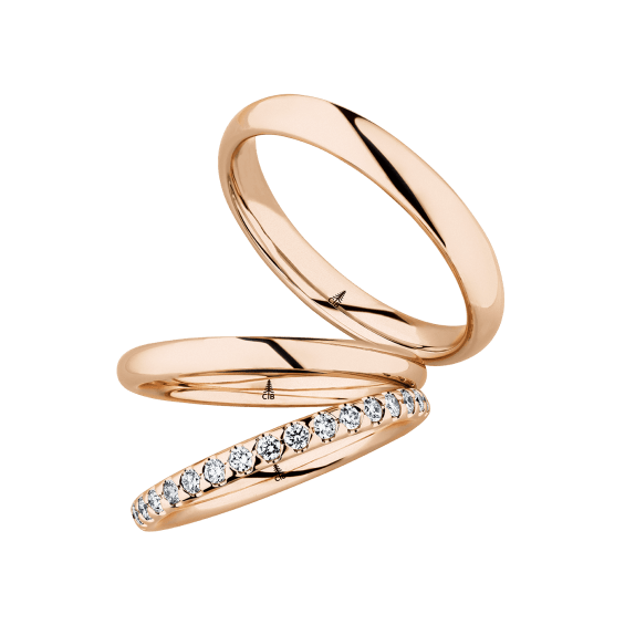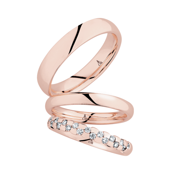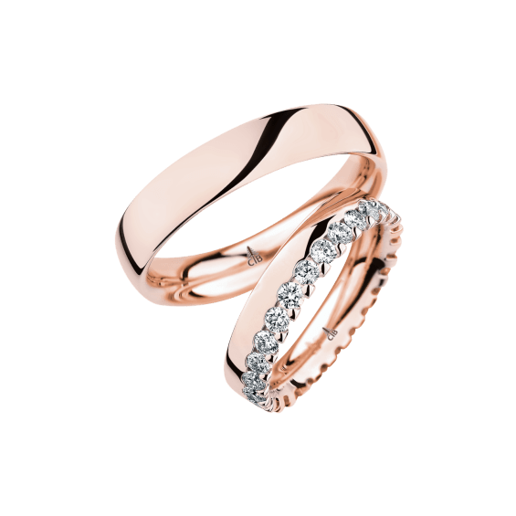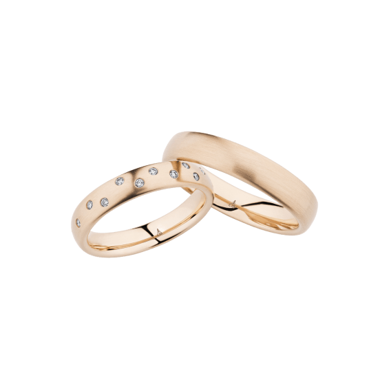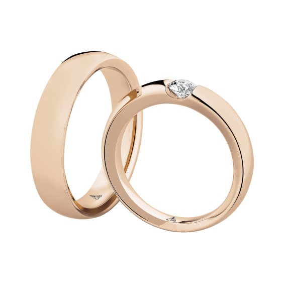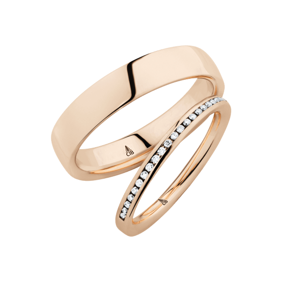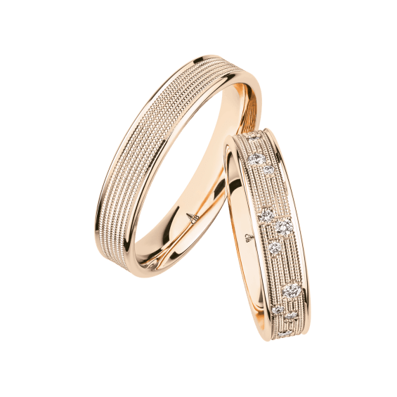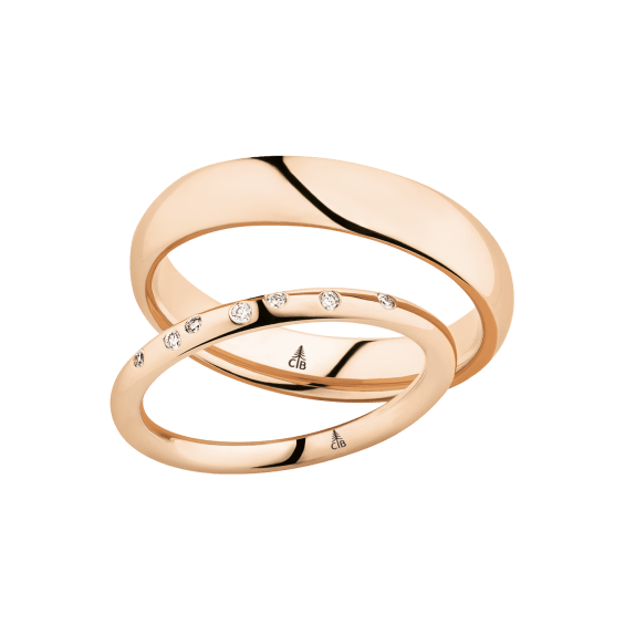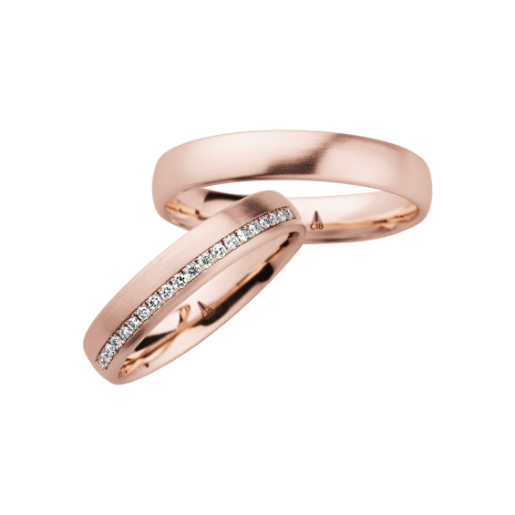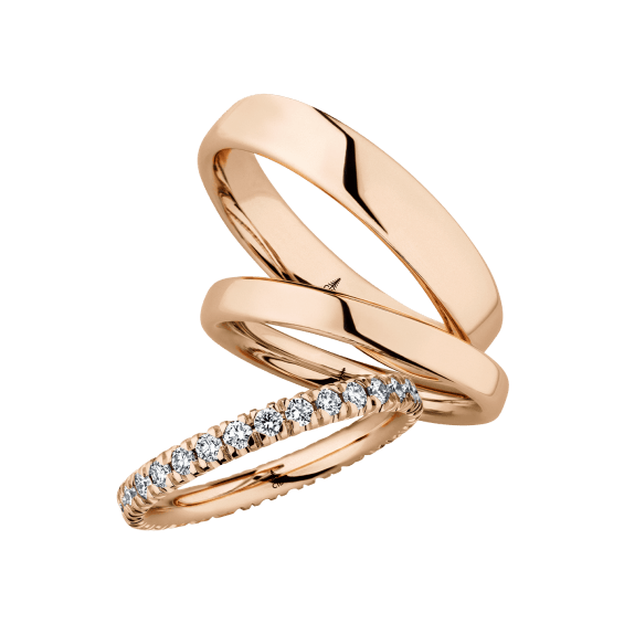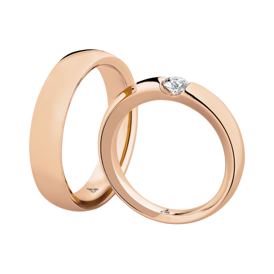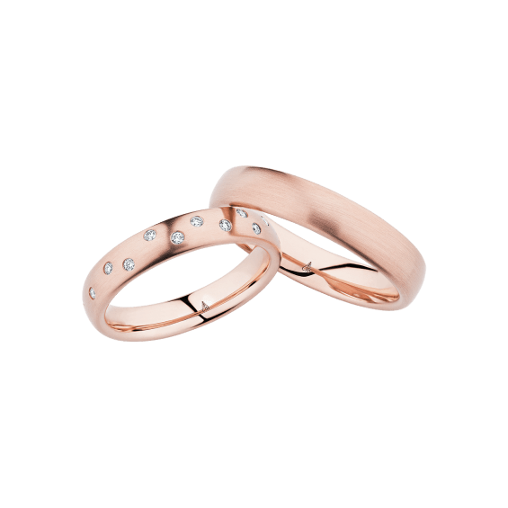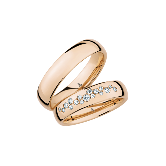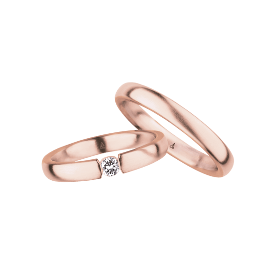 The round shape of the rings and the warm color of the rose gold form a successful unit with the unusual design of the diamond settings.