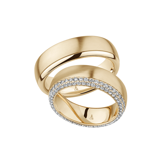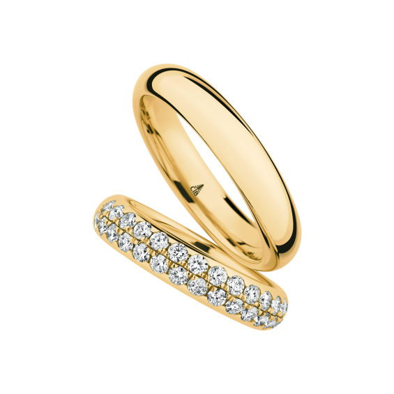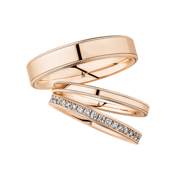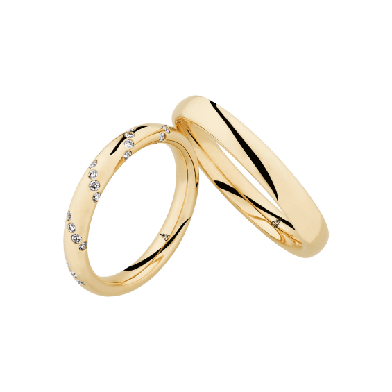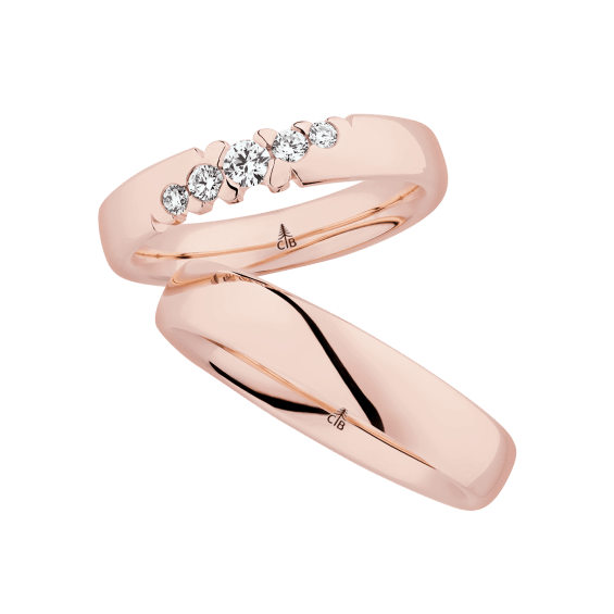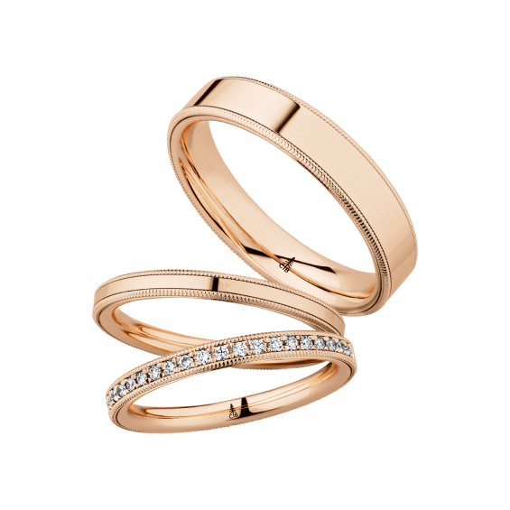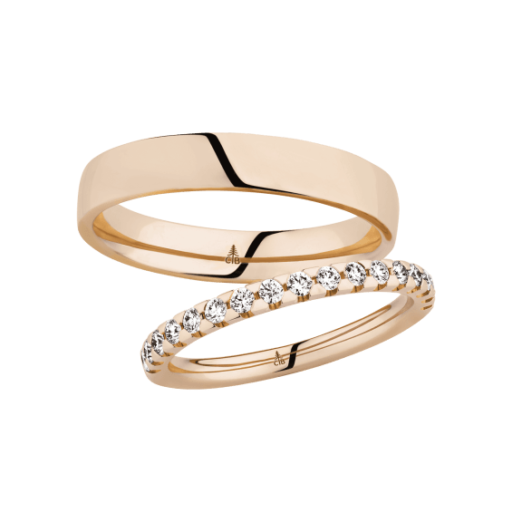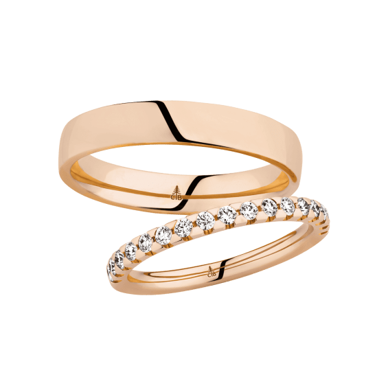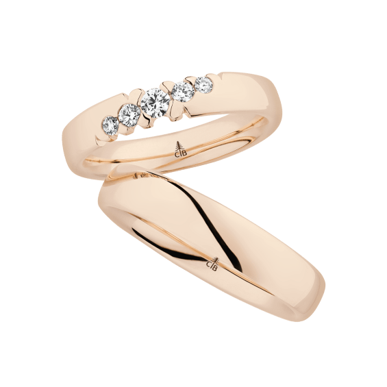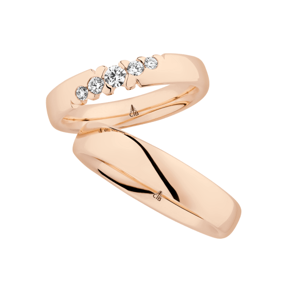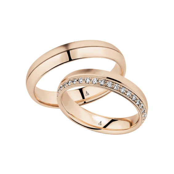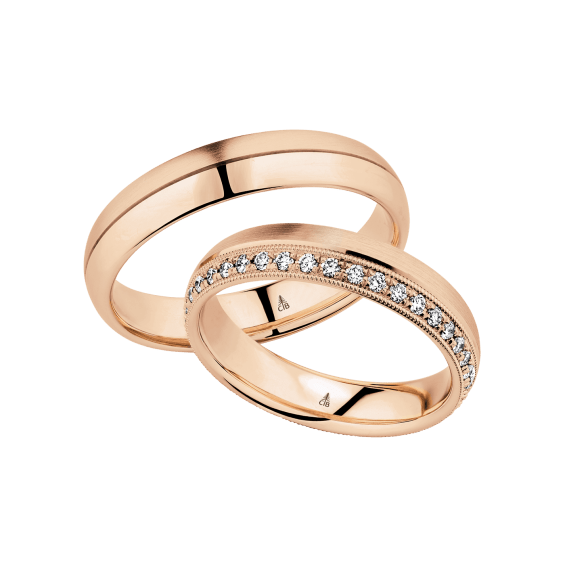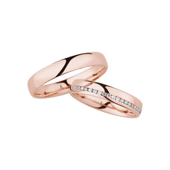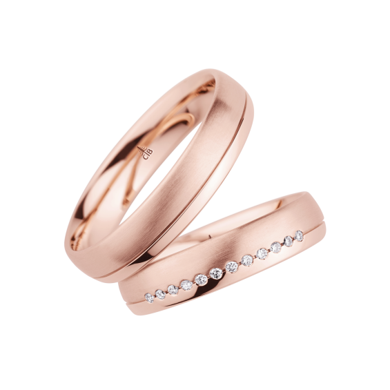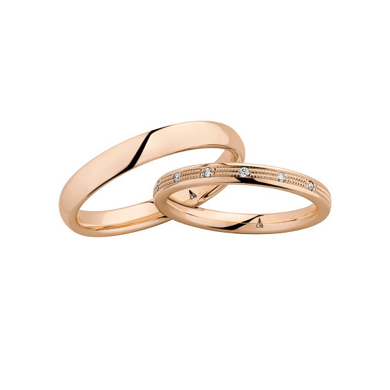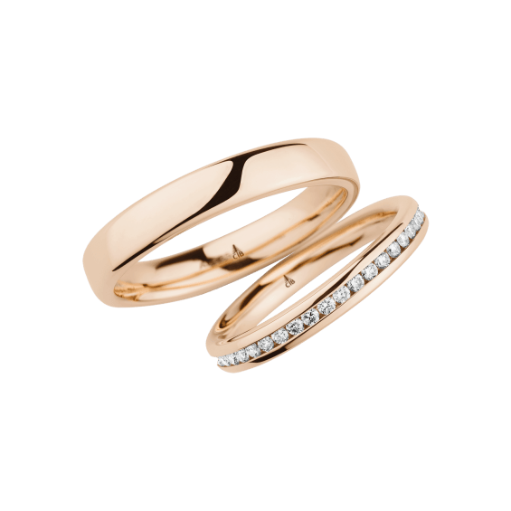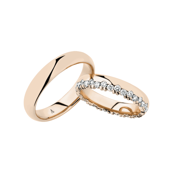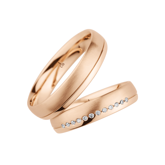 The round shape of the rings and the warm color of the rose gold form a successful unit with the unusual design of the diamond settings.
