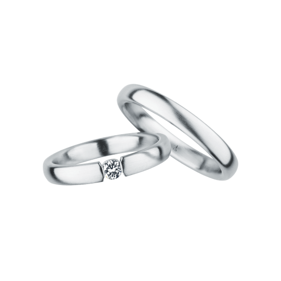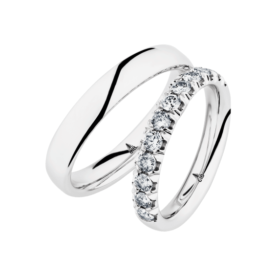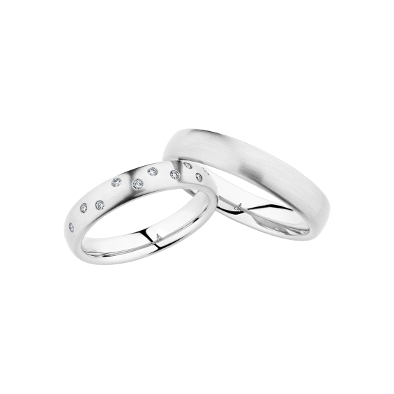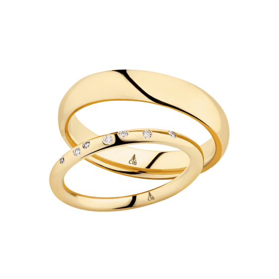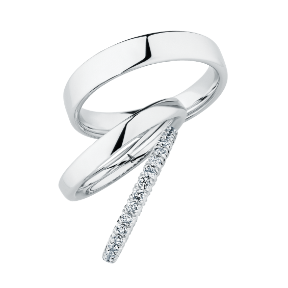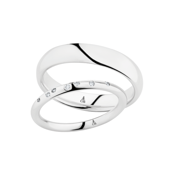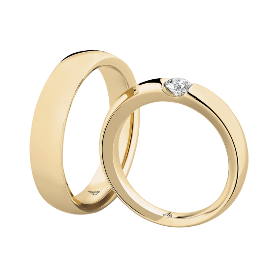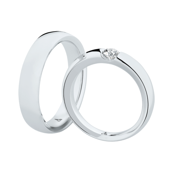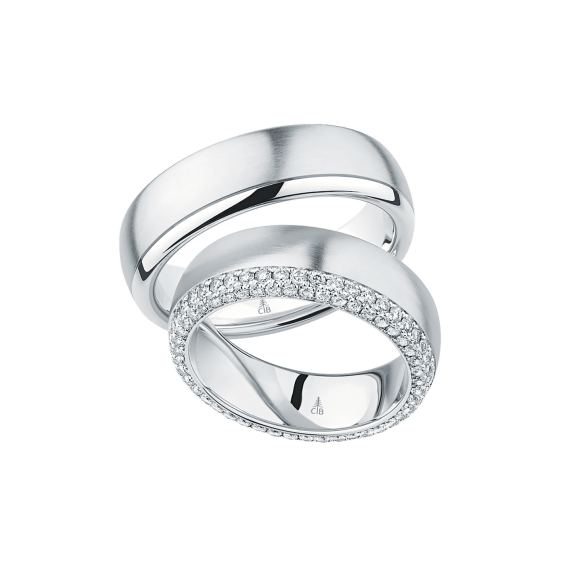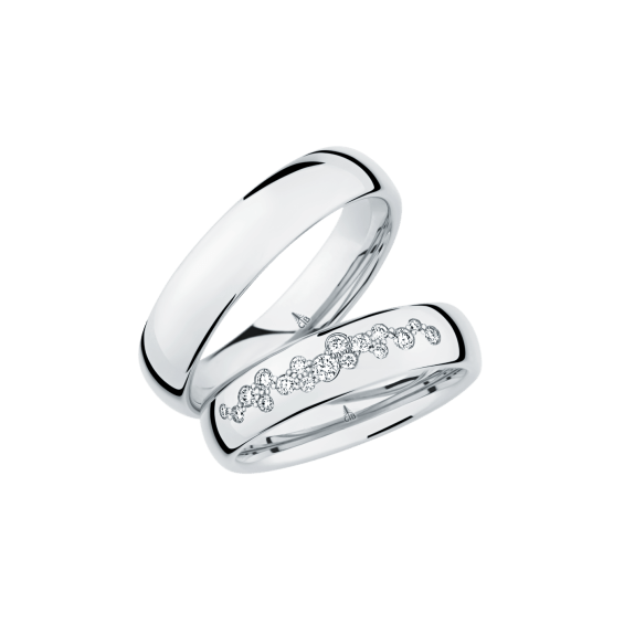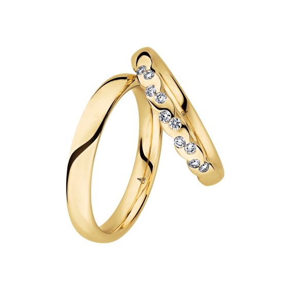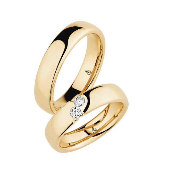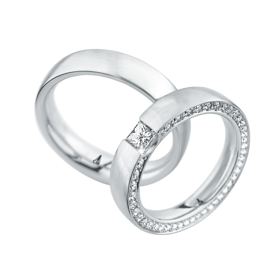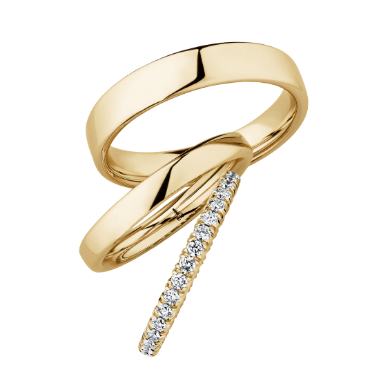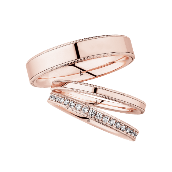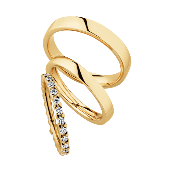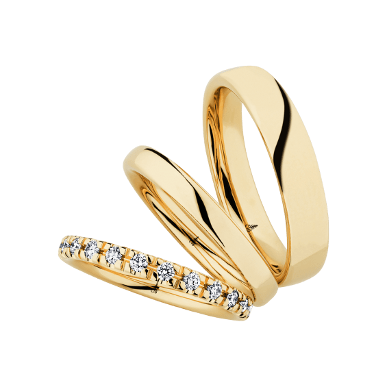 The round shape of the rings and the warm color of the rose gold form a successful unit with the unusual design of the diamond settings.