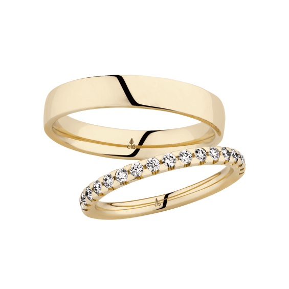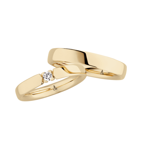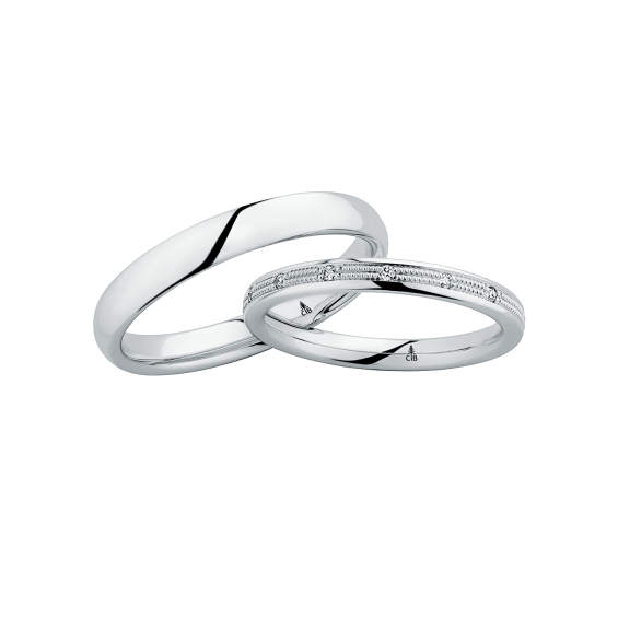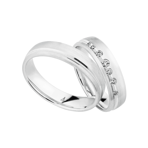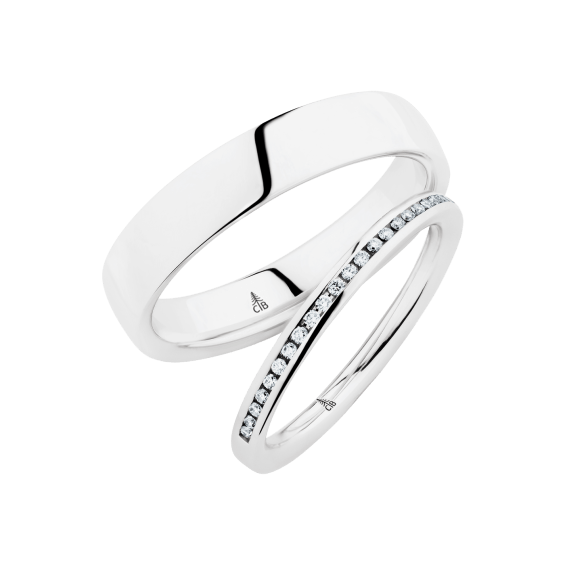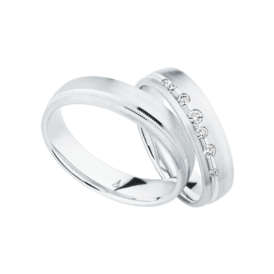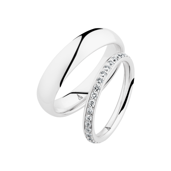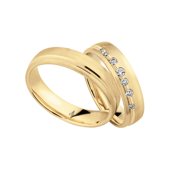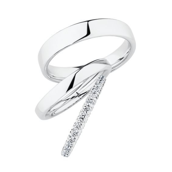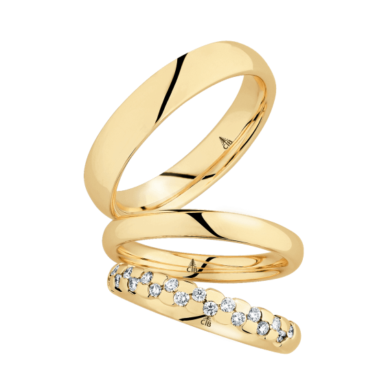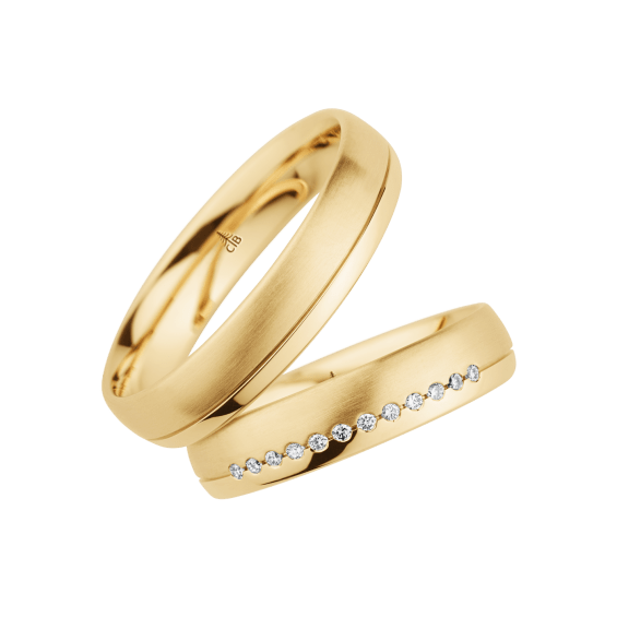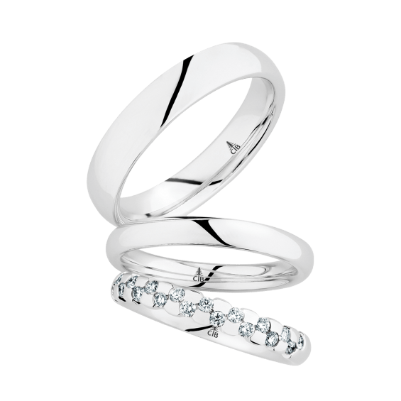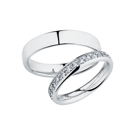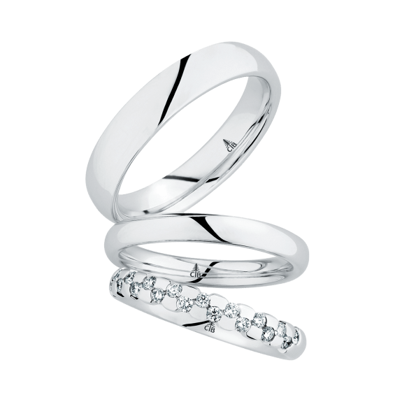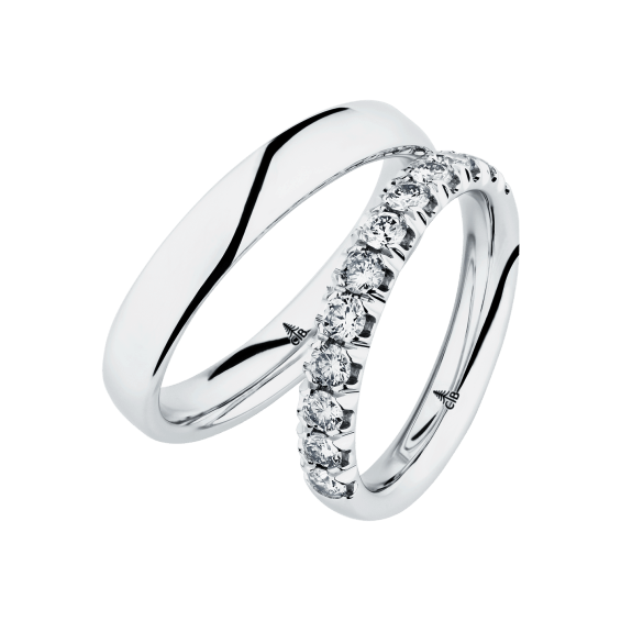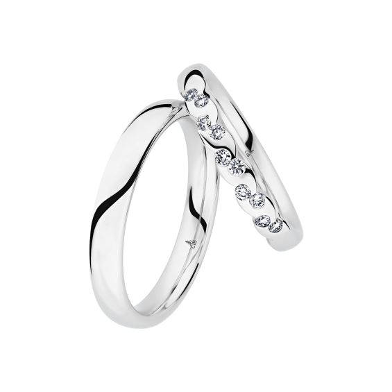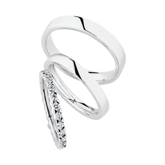 The round shape of the rings and the warm color of the rose gold form a successful unit with the unusual design of the diamond settings.